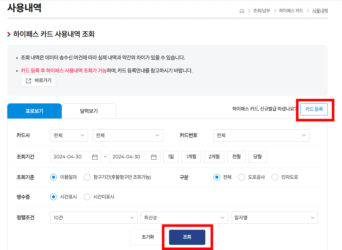 로그인이 완료되었으면 다시 사용내역 조회 메뉴를 클릭하면 위와 같은 페이지를 볼 수 있습니다. 하이패스 카드의 사용내역은 하이패스 카드 등록 후 조회가 가능하므로 아직 등록하지 않았다면 우측의 [카드 등록] 버튼을 클릭하시기 바랍니다.