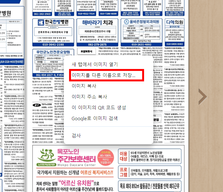 해당 일자의 교차로 신문이 컴퓨터 화면에 보이게 되면 좌측 메뉴에서 [구인]을 클릭합니다. 목포교차로 신문의 구인 페이지가 표시되면 다양한 일자리를 확인할 수 있습니다. 하지만 글씨가 작아 잘 보이지 않는다면 원하는 신문 면 위에 마우스를 놓고 우클릭으로 세부 메뉴를 실행합니다. 세부메뉴에서 [이미지를 다른 이름으로 저장]을 선택합니다.