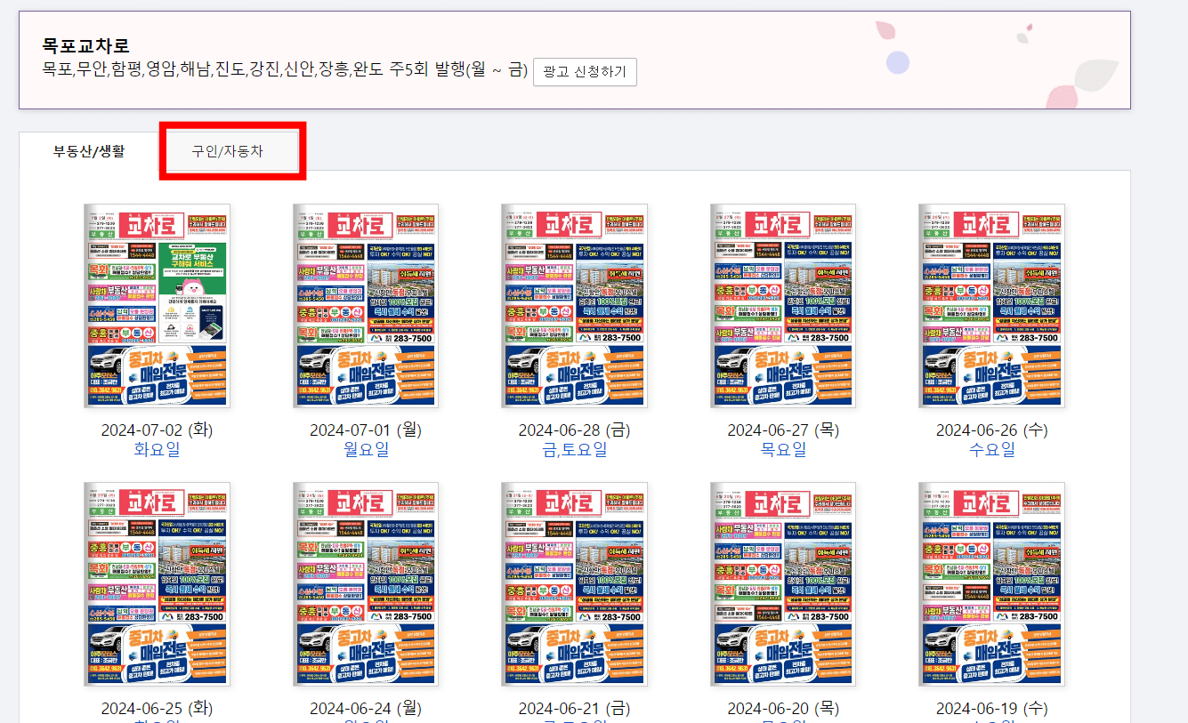 목포교차로 신문면에 방문하시면 위와 같은 화면을 볼 수 있습니다. 교차로 신문 상단에서 [구인/자동차]를 선택합니다. 이후 최신 일자의 교차로 신문을 마우스로 클릭합니다.