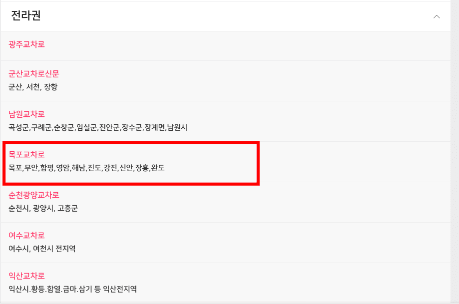 교차로 홈페이지에 도착하시면 위와 같은 화면을 볼 수 있습니다. 서울권, 경기권, 강원권, 경상권, 전라권 등 중 전라권을 마우스로 클릭합니다. 전라권 하단에 광주, 군산, 남원, 목포, 여수 등의 교차로를 찾아볼 수 있습니다. 목포교차로를 선택합니다.