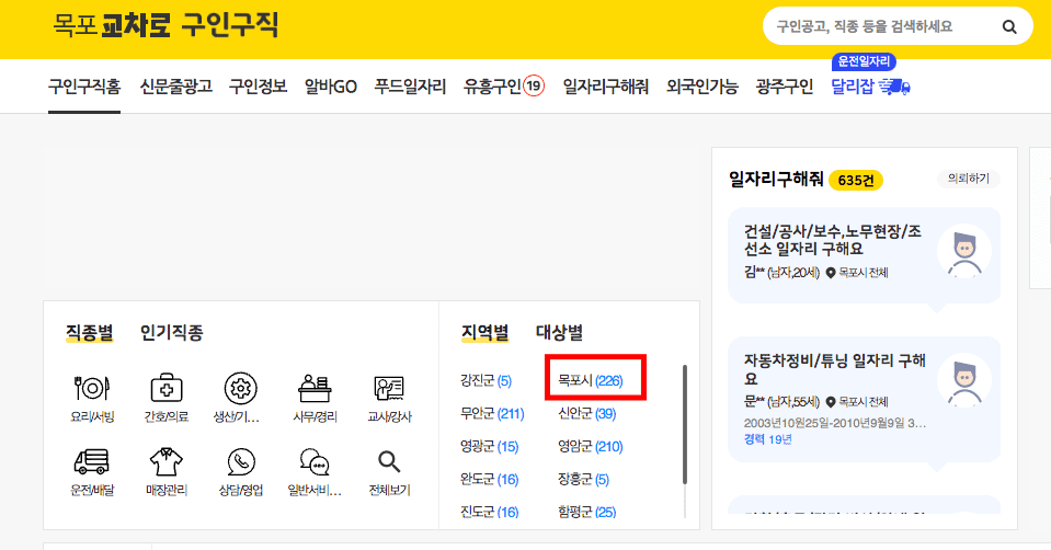목포교차로 페이지로 이동하면 상단 메뉴에서 [구인구직] 메뉴를 선택합니다. 목포교차로 구인구직 페이지가 표시되면 홈 화면에서 직종별, 지역별, 대상별 조회가 가능합니다. 여기에서는 대상별 > 목포시를 선택해 보겠습니다.