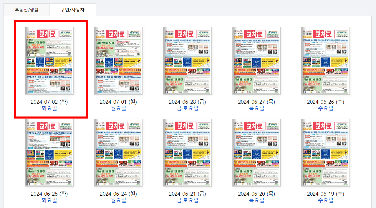 목포교차로 신문면에 방문하시면 위와 같은 화면을 볼 수 있습니다. 교차로 신문 상단에서 [구인/자동차]를 선택합니다. 이후 최신 일자의 교차로 신문을 마우스로 클릭합니다.