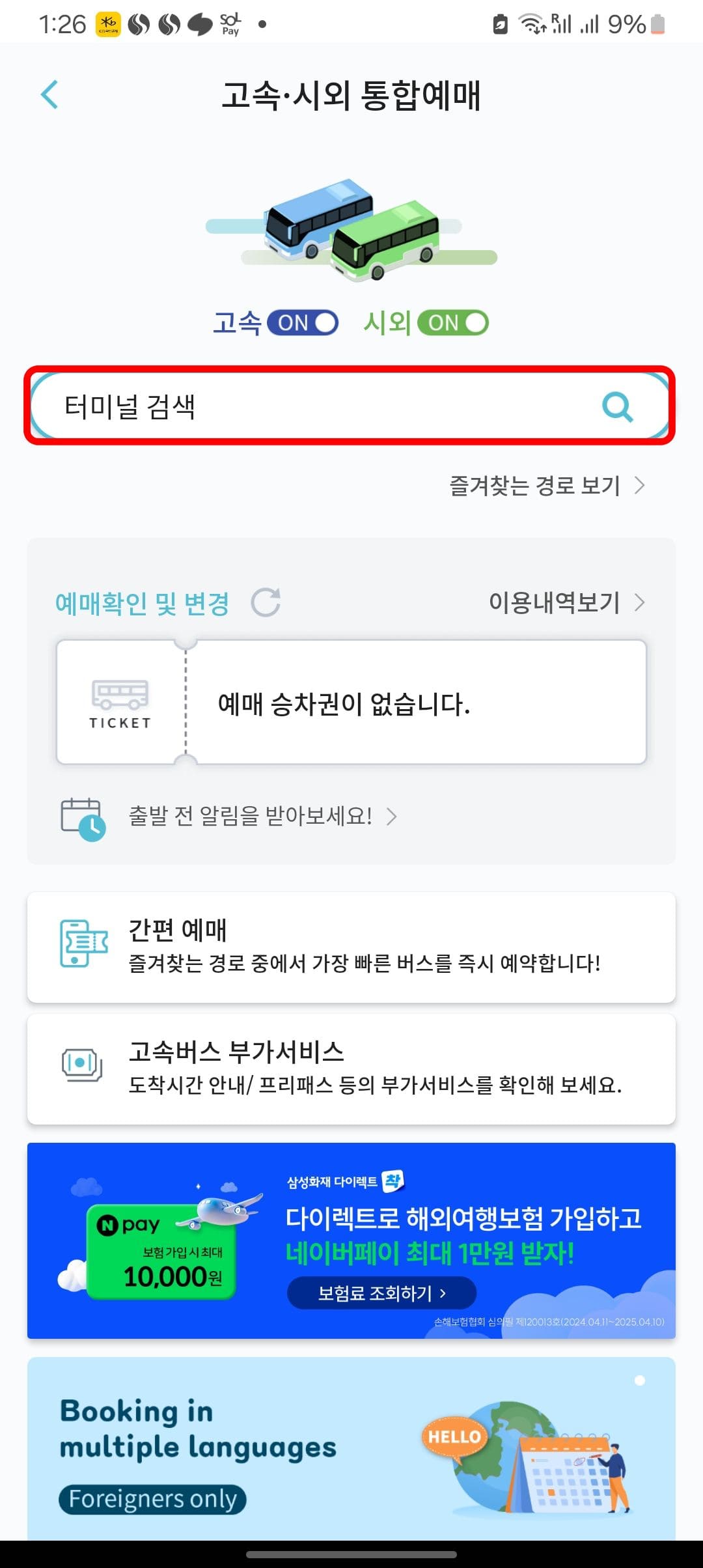 티머니고 앱을 실행하면 위와 같은 화면을 볼 수 있습니다. 표시된 [고속 시외버스] 메뉴를 터치합니다. 고속 시외 통합예매 페이지가 표시되면 상단에서 터미널 검색 메뉴를 터치합니다.