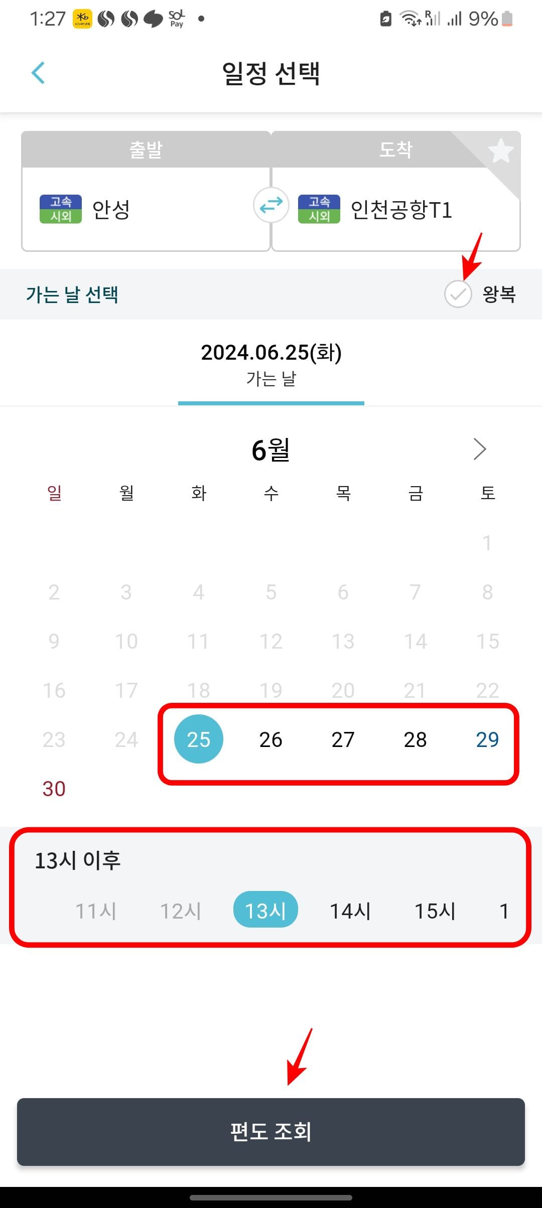 일정 선택 화면에서 가는 날과 시간대를 선택합니다. 만약 왕복 예매를 원한다면 상단 우측의 [왕복]을 체크하시기 바랍니다. 배차조회에서 출발시간과 남은 좌석등을 확인하고 조건이 맞다면 터치합니다.