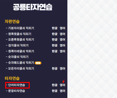 단어나 문장 연습을 하시려면 좌측 메뉴에서 해당 항목의 우측의 영어 메뉴를 클릭합니다.