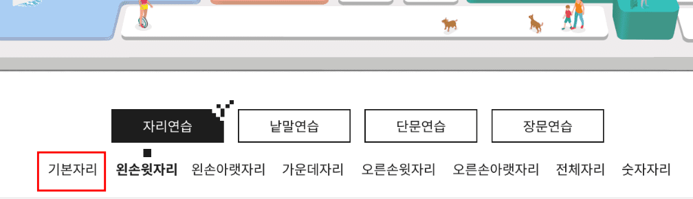 자리연습으로 마우스를 가져가면 기본자리, 왼손윗자리, 왼손아랫자리 등 다양한 자리의 연습이 가능합니다. 기본자리부터 진행해 보도록 하겠습니다.