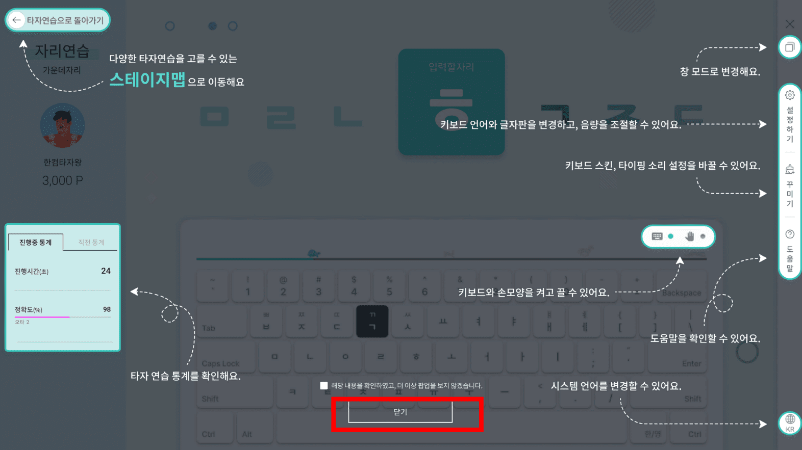 타자 연습에 대한 가이드가 표시됩니다. 하단의 ‘닫기’ 버튼을 클릭합니다. 처음에는 한글 연습으로 되어 있으니 우측 하단의 [KR]을 클릭하여 [EN]으로 변경해줍니다.