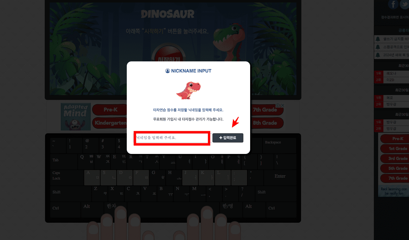 공룡타자연습 홈페이지에 도착하면 위와 같이 닉네임 입력화면이 나옵니다. 입력란에 닉네임을 입력하고 우측의 [입력완료] 버튼을 클릭합니다.