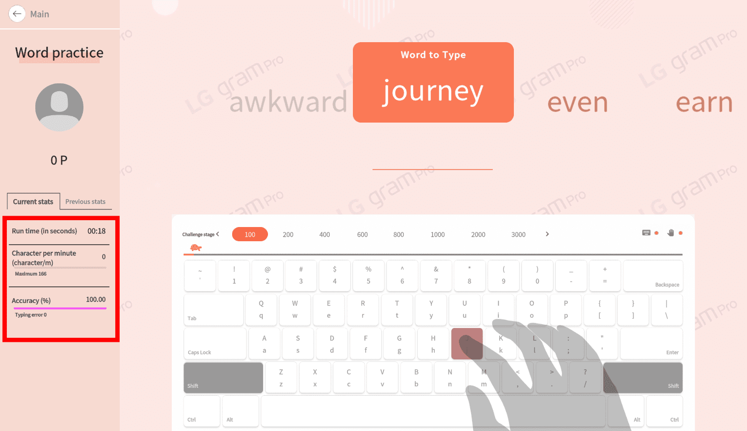 영어 단어 연습도 마찬가지로 상단에 표시된 영단어를 키보드를 사용하여 입력하고 엔터키를 누르면 됩니다. 좌측메뉴에서 러닝타임과 정확도를 체크할 수 있습니다.