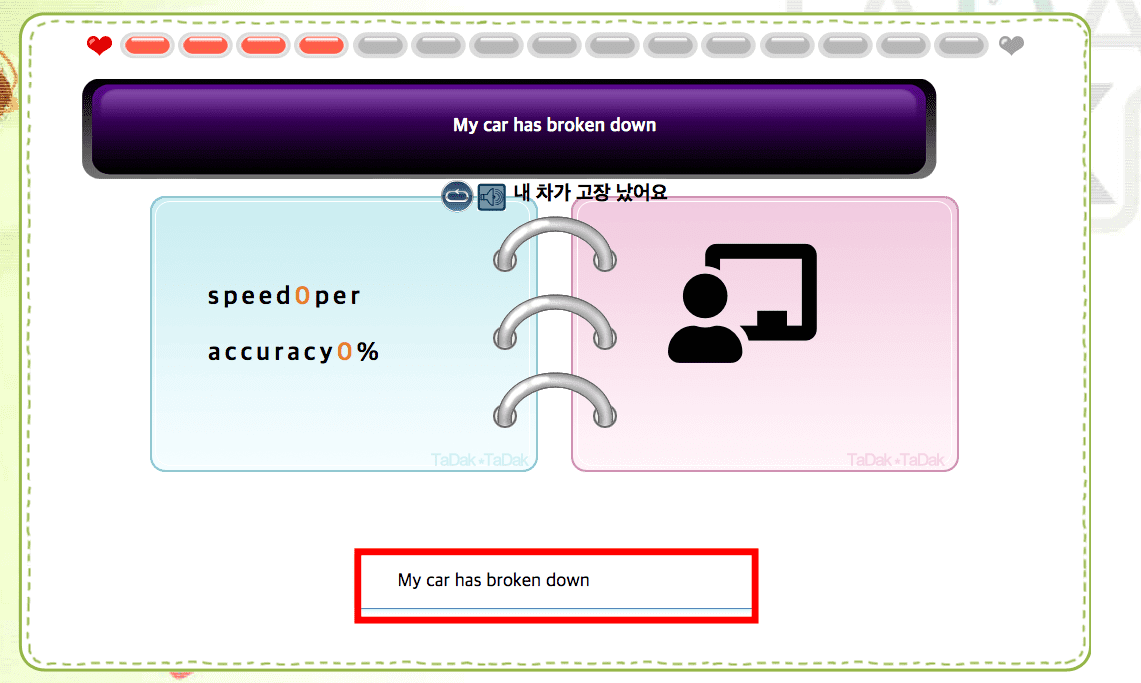 상단에 표시된 영어문장을 하단의 입력란에 키보드로 입력하면 됩니다. 문장을 읽어주기도 하고 하단에 문장의 의미도 쓰여있기 때문에 영어 공부를 하는데도 효과적이라고 생각합니다. 문장 입력 후 엔터를 치면 하단의 점수와 정답률이 반영되니 직접 확인해 보시기 바랍니다.