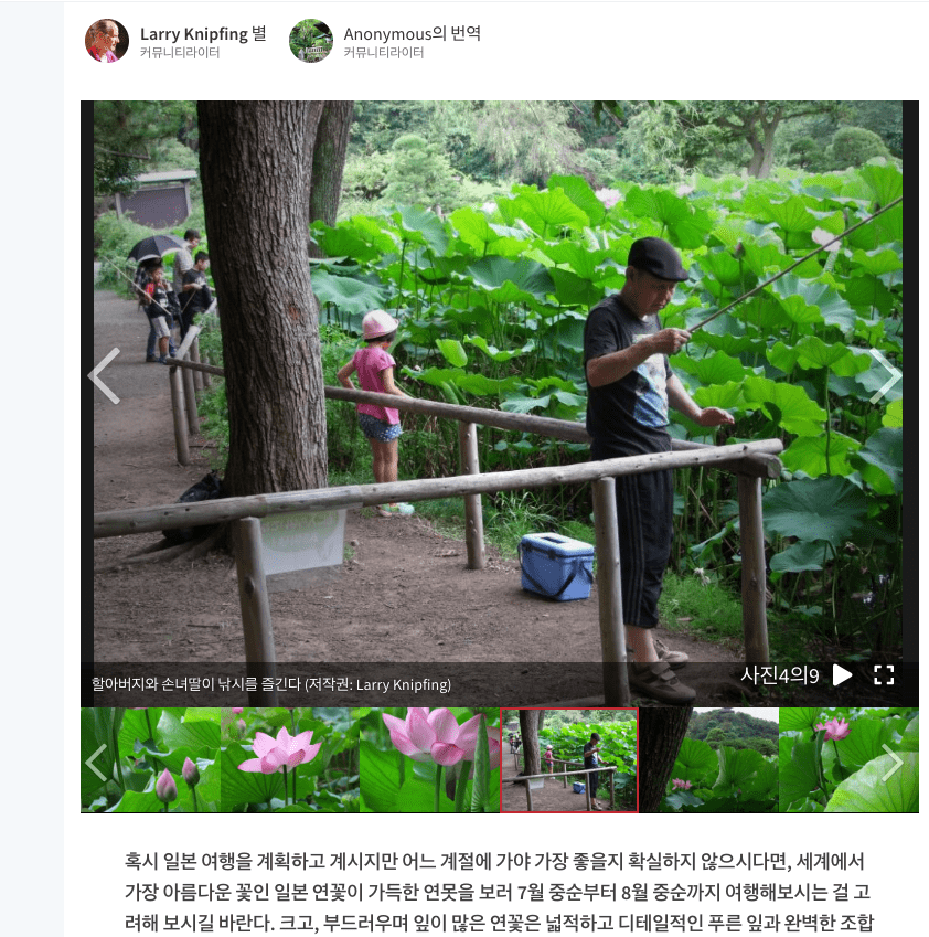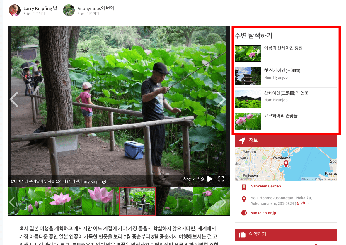 이곳은 산케이엔 정원이며 연꽃 연못을 볼 수 있다고 합니다. 우측에서 주소확인이 가능하며 사진을 보려면 하단의 [사진 보기] 버튼을 선택합니다. 저널리스트가 작성한 해당 지역의 사진들과 설명을 볼 수 있습니다. 글 우측에는 해당 지역 주변에서 볼만한 명소들이 표시되니 한번씩 확인해 보는 것을 권장드립니다.