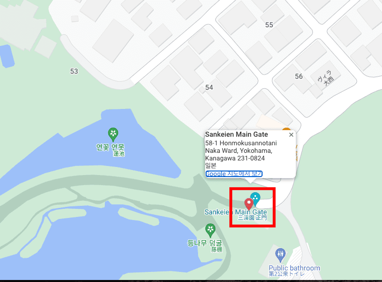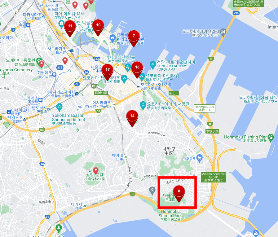 좌측메뉴에서 관심있는 지역을 선택합니다. 이번에는 요코하마를 선택해 보았습니다. 요코하마 시가 한글로 우측에 표시됩니다. 붉은색 기둥으로 보이는 아이콘은 명소의 집합 지역이니 클릭해 보도록 합니다. 지도가 확대되면 다시 세부 적인 명소를 지도에서 선택합니다. 목적지가 보이면 다시 한번 아이콘을 클릭합니다.