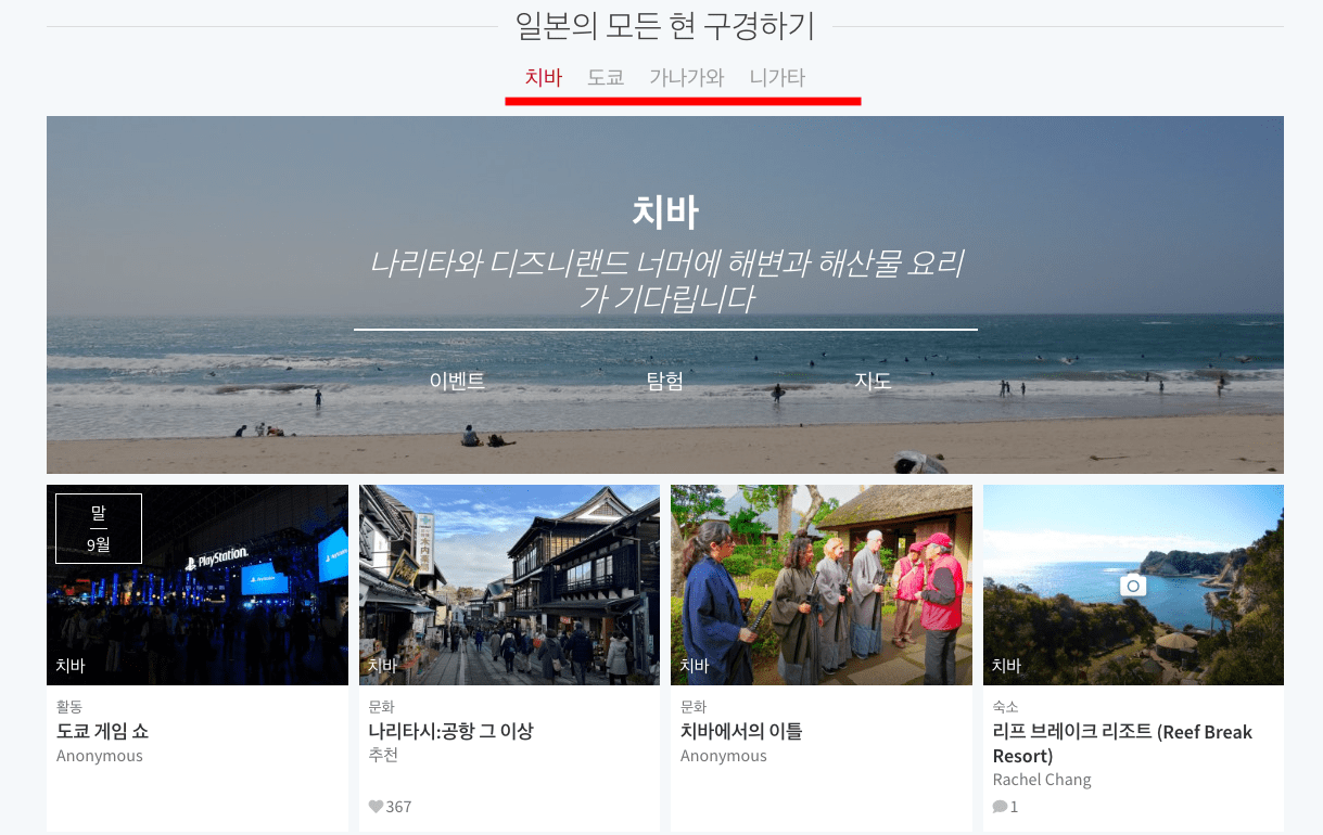 이외에도 일본 전역의 문화 관광에 대한 자세한 정보를 얻을 수 있어 일본 여행을 계획할 때 도움이 많이 되고 있습니다. 지역별로 탐색이 가능하고 치바, 도쿄, 가나가와, 니가타 현 순으로 관광정보를 얻기에 용이합니다.