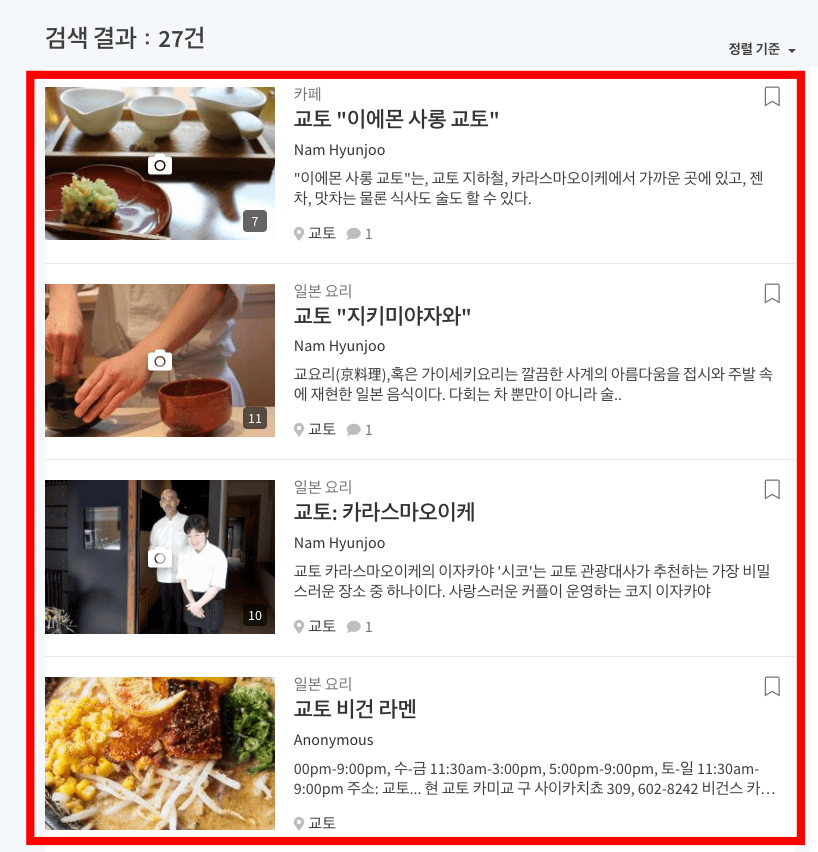 음식 페이지 하단의 입력창에 지역명을 입력합니다. 쿄토를 검색합니다. 교토에 있는 다양한 맛집 정보들이 표시됩니다. 블로그 리뷰로 방문한 음식점들보다 현지인이 추천한 음식점이라 더 신뢰가 갑니다.