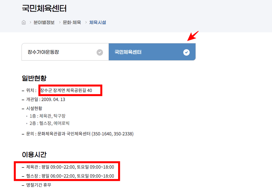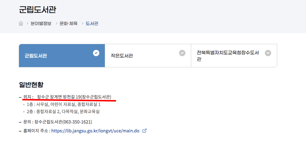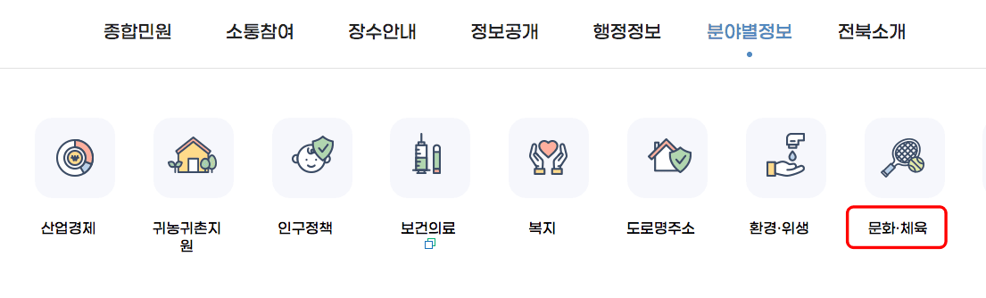 장수군청에서는 군내에 위치한 도서관이나 체육시설 정보도 공개하고 있습니다. 메인 메뉴 분야별 정보 > 문화 체육 메뉴를 선택합니다.