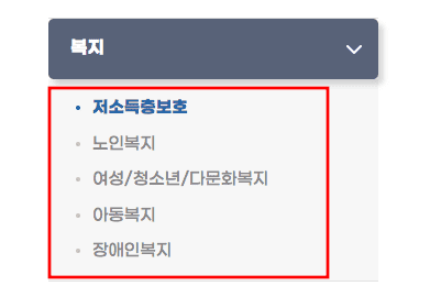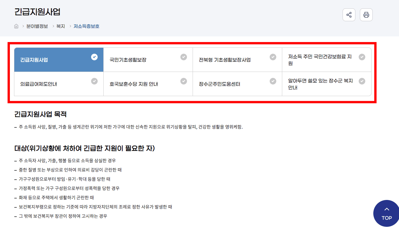 장수군의 복지 지원 사업은 긴급지원, 국민기초생활보장, 저소득 주민 국민건강보험료 지원 등 다양한 내용을 확인할 수 있습니다. 또한 좌측 메뉴를 보시면 노인복지, 여성, 청소년, 아동 복지, 장애인 복지 등 다양한 복지 정보확인이 가능합니다.