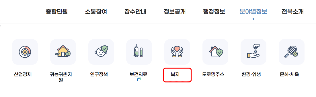 장수군청 홈페이지에 도착하시면 위와 같은 메인 화면을 확인할 수 있습니다. 상단 메뉴 우측의 [분야별 정보]로 마우스를 가져갑니다. 세부 메뉴가 하단에 표시되면 [복지] 메뉴를 선택합니다.