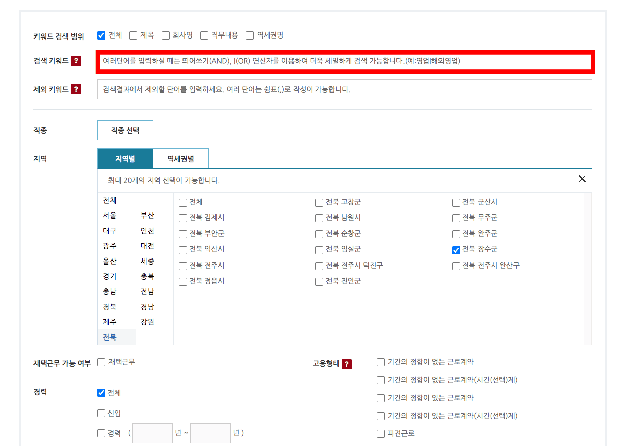 상세 검색 페이지가 표시되면 검색 키워드, 직종 등을 선택하고 우측 하단에서 검색 버튼을 클릭합니다. 검색결과를 확인하시면 장수군 내의 다양한 채용정보를 확인할 수 있으니 직접 확인해 보시기 바랍니다.