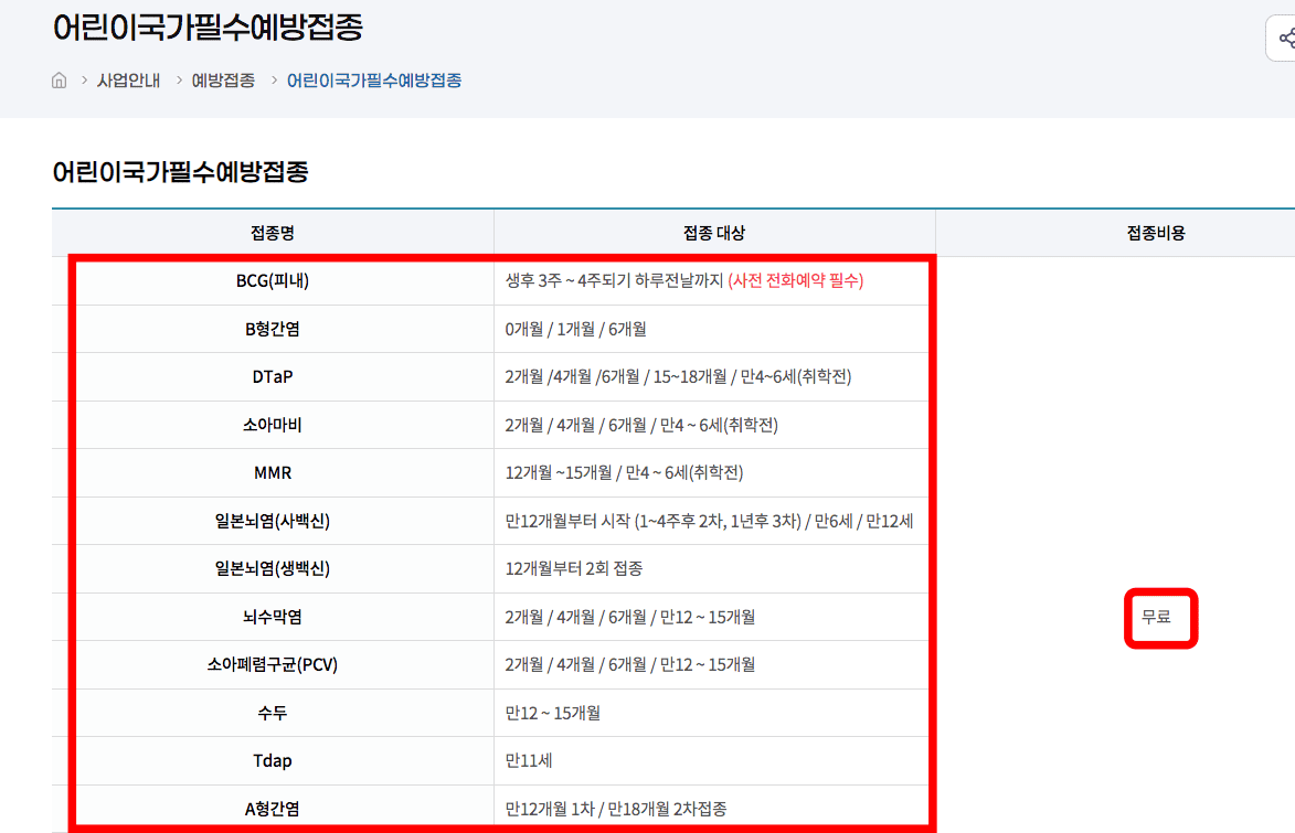 어린이 국가 필수 예방접종 목록이 표시됩니다. 접종비용이 없는 접종명은 소아마비, 일본뇌염, 뇌수막염, 수두, 간염 등 다양하니 자녀가 있으시다면 꼭 확인하시기 바랍니다.