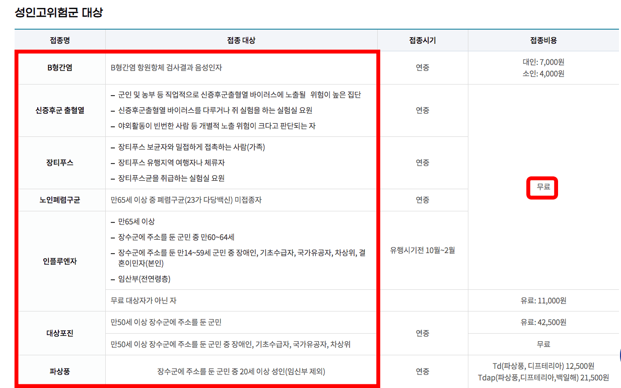 성인고위험군 대상의 예방접종 정보도 확인이 가능합니다. 접종명에 따라 비용이 발생할 수 있으니 참고하시기 바랍니다.