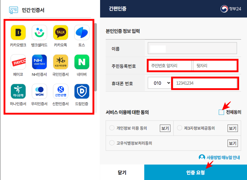 인증 창이 표시되면 간편인증, 공동인증, 금융인증 중 보유한 인증수단을 선택합니다. 여기에서는 간편 인증으로 진행해 보았습니다. 간편 인증 페이지 좌측에서 보유한 민간인증서를 선택하시고 우측에서 이름과 주민등록번호, 휴대폰 번호 서비스 이용에 대한 전체 동의 표시 후 하단의 인증 요청을 선택합니다.