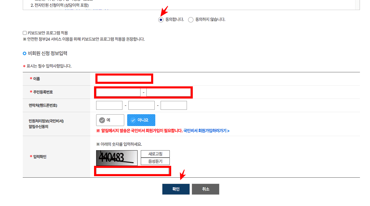 회원, 비회원 선택 창이 표시되면 비회원 신청하기를 선택합니다. 어르신들의 경우 회원가입을 새로해야 하면 어려울 수 있으므로 비회원 신청하기가 권장됩니다. 개인정보 이용에 관한 동의에 전체 동의하시고 하단에서 이름, 주민등록번호, 입력확인 숫자를 입력하신 후 하단의 확인 버튼을 클릭합니다.