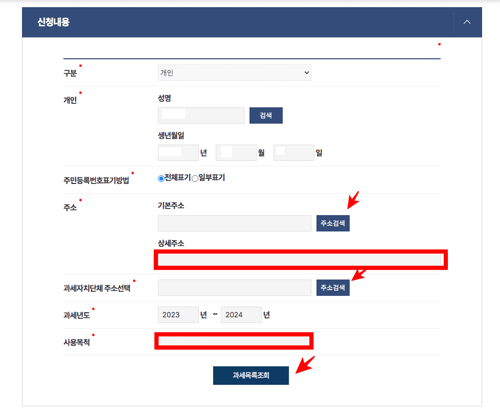 신청내용에 ‘주소검색’ 버튼을 클릭하여 주소입력 상세주소 입력 후, 하단 과세자치 단체주소선택 우측의 주소검색을 클릭하여 동일한 주소와 관할기관을 선택합니다. 과세 연도를 설정하고 사용목적을 조회라고 입력한 후 하단의 과세목록조회 버튼을 클릭합니다.