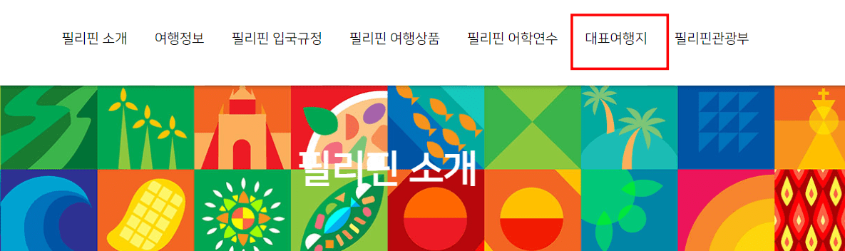 어느나라를 여행가든지 대표적인 여행지가 있기 마련입니다. 필리핀의 대표 여행지도 필리핀 관광청 홈페이지에서 확인이 가능합니다. 필리핀 관광청 홈페이지 상단 메뉴에서 [대표 여행지]를 마우스로 클릭합니다.