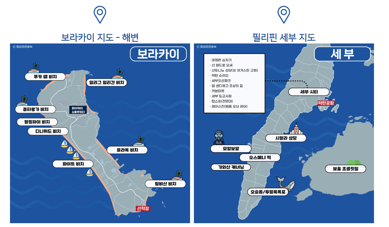 필리핀 지도 페이지를 확인해 보시면 필리핀 주요 도시를 한글 버전으로 확인할 수 있습니다. 또한 우리나라 사람들이 자주 방문하는 보라카이, 세부 지도도 한글판으로 확인이 가능합니다.