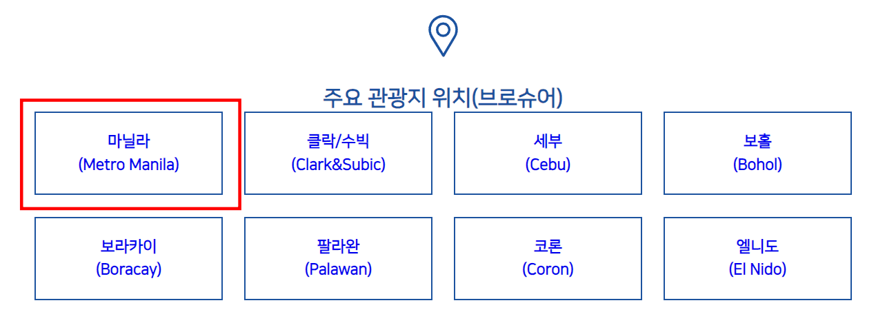 스크롤을 내리면 다운로드가 가능한 브로슈어를 필리핀 주요관광지별로 확인할 수 있습니다. 여기에서는 마닐라를 클릭하여 확인해 보도록 하겠습니다. 브로슈어를 확인하니 마닐라는 주요 관광지가 필리핀 지도 한글판 설명으로 보이니 직접 확인해 보시기 바랍니다.