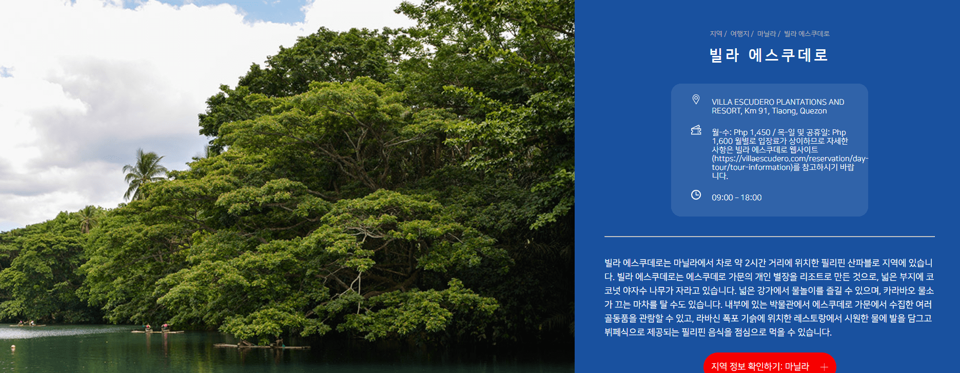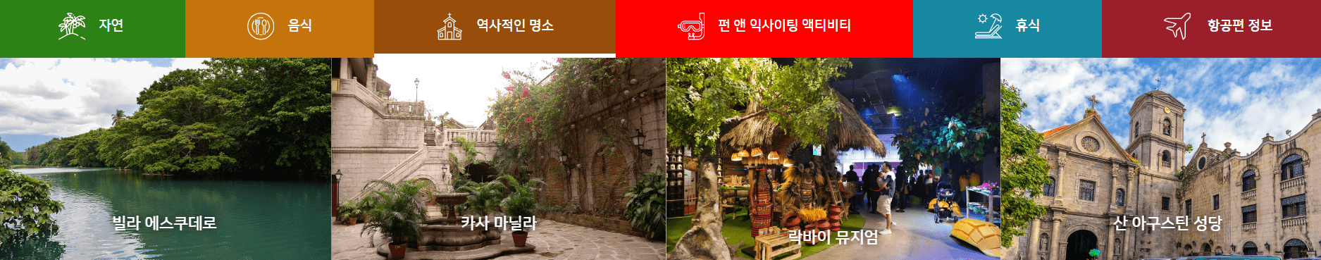 페이지를 확인하시면 필리핀의 다양한 대표 여행지를 확인할 수 있습니다. 여기에서는 마닐라는 확인해 보겠습니다. 마닐라 페이지 좌측을 확인하시면 마닐라에 대한 설명과 우측 상단에서 e북을 저장할 수 있습니다. 하단의 [역사적인 명소]를 클릭하면 마닐라에 위치한 역사적인 명소들을 사진으로 확인할 수 있으며 클릭하면 세부 정보를 확인할 수 있습니다.