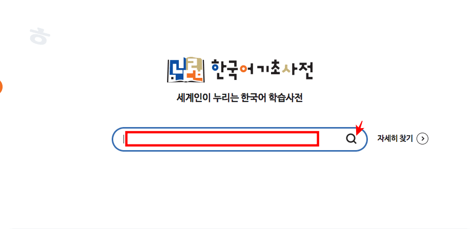 국립국어원 홈페이지에 방문하시면 위와 같은 화면을 볼 수 있습니다. 좌측의 한국어 기초사전 바로가기를 선택합니다. 한국어기초사전 검색창이 표시되면 원하는 단어를 입력하고 돋보기를 선택합니다.